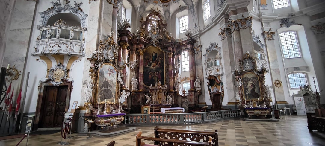 Im Inneren erwartet die Besucher ein beeindruckendes Barockspektakel: Imposante Deckengemälde, Stuck allüberall,